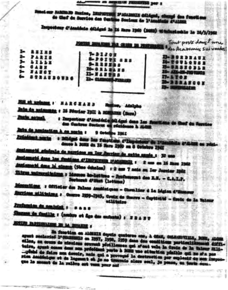 Le premier dans l’ordre chronologique est la demande dactylographiée, non datée, de mutation en France de Max Marchand. Il est probable qu’elle fut envoyée avant la fin de l’année 1961 ou au tout début de l’année 1962. On remarquera en bas les motifs détaillés ainsi que, dans la partie supérieure, l’ajout d’une mention manuscrite éloquente.