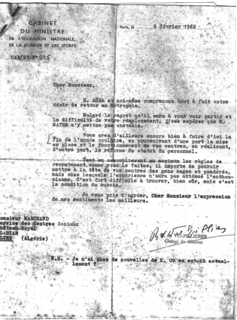 Le deuxième est la réponse du ministère de l’Éducation nationale, datée du 5 février 1962 et signée R. de Vulpillières. On notera la marque en marge, vraisemblablement de la main de Max Marchand, encadrant la première phrase du 3e paragraphe, laquelle signifie clairement qu’il ne doit pas espérer être muté avant la fin de l’année scolaire. Rappelons qu’à ce moment-là, le ministre de l’Éducation nationale est M. Lucien Paye, qui fut, en 1946, directeur des Affaires musulmanes en Algérie ainsi qu’un des rédacteurs du Statut de 1947, et, de juin 1956 à juin 1957, directeur général des Affaires politiques et de la Fonction publique au gouvernement général d’Alger, moment où Robert Lacoste était ministre résidant. Paye avait alors pour adjoint militaire le colonel de Vulpillières…