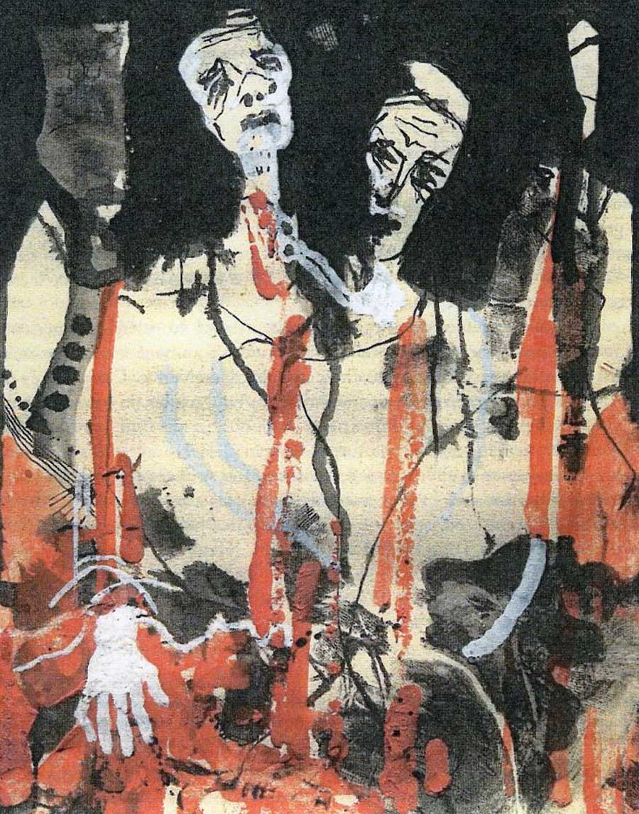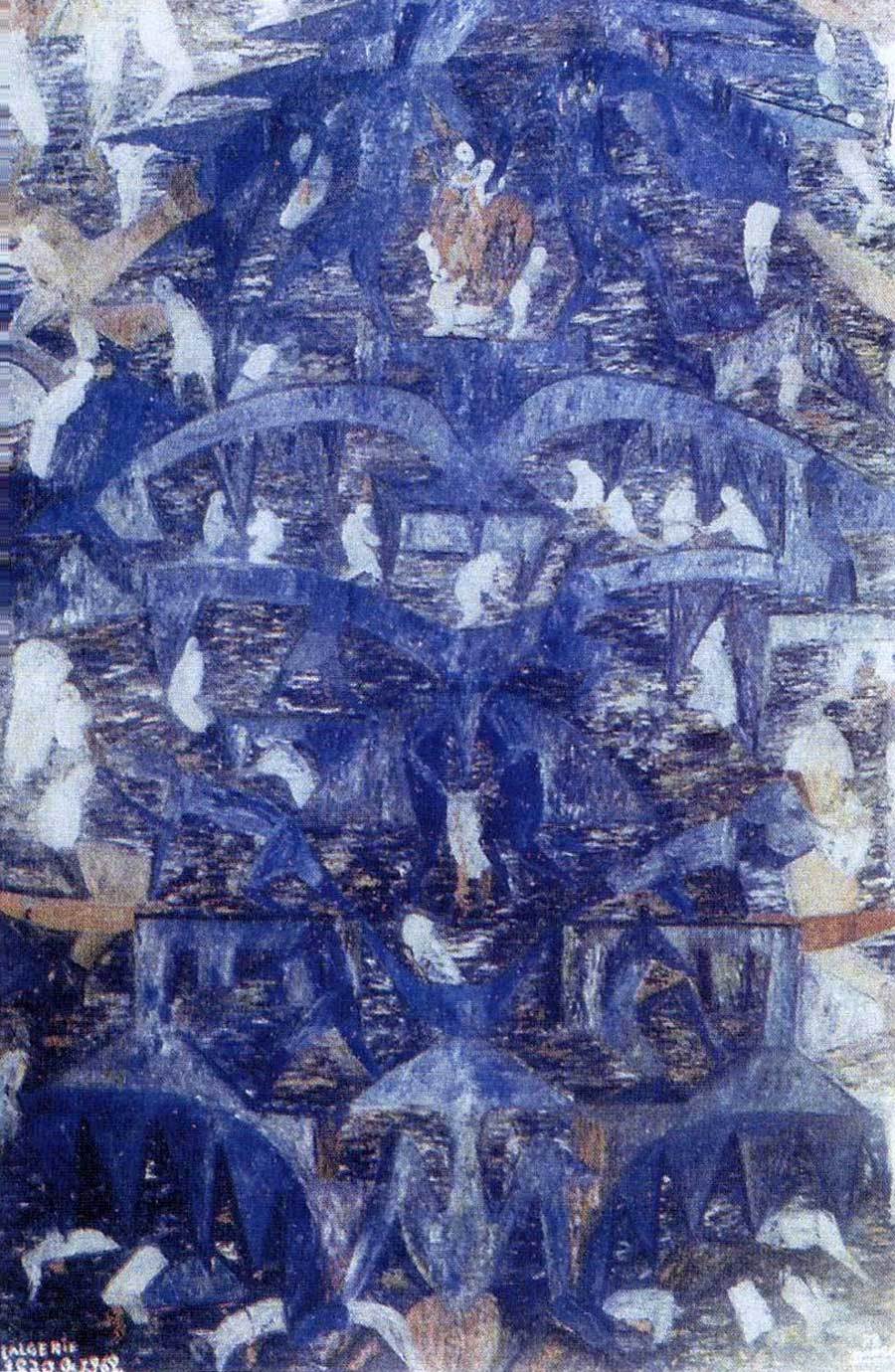 Être peintre en Algérie : 1950-1970, c’est aussi Henri Caillet, Ange Diaz-Ojeda, Augustin Ferrando, Jean Simian, Raoul Tarrou (c’est dans La Peste Jean Tarrou, voisin et ami du docteur Rieux), le temps imparti ne nous permet pas de vous évoquer tous, mais, tous, vous avez impulsé la volonté de création à de nouvelles générations d’artistes et lancé la peinture algérienne dans la grande aventure de la peinture mondiale. Peut-être héritiers d’Eugène Delacroix, comme Houria Niati, née en 1948 à Khemis Miliana, emprisonnée à douze ans pour avoir dessiné des slogans anti-français sur des murs et qui reprit dans le panneau central de sa série de cinq peintures No to torture, 1982-1983, la scène « Femmes d’Alger dans leur appartement ».